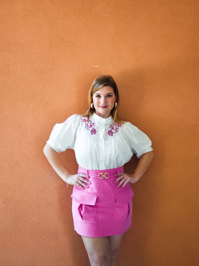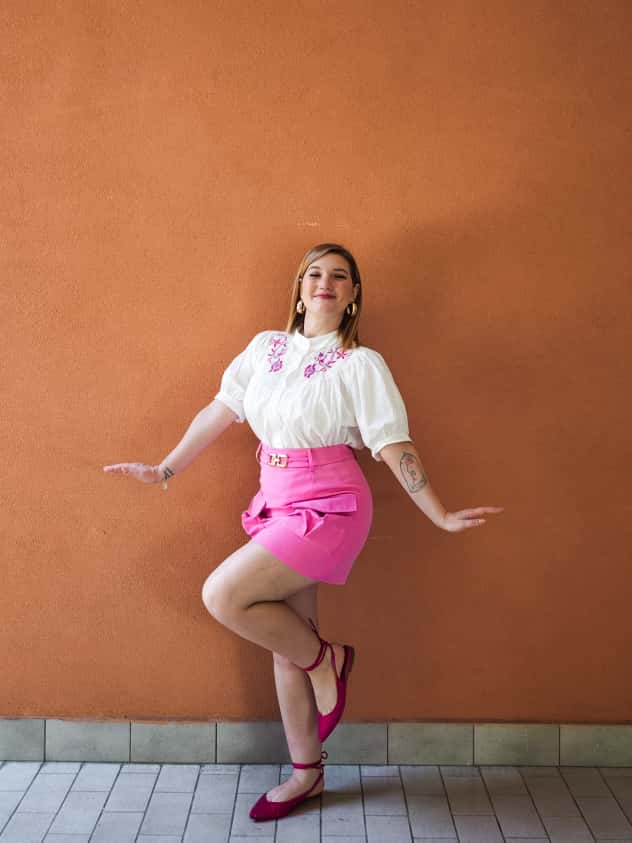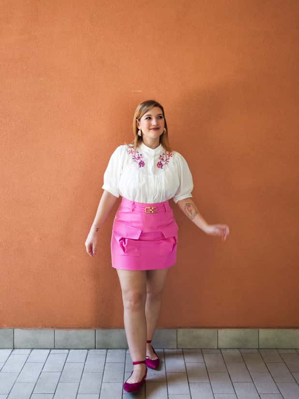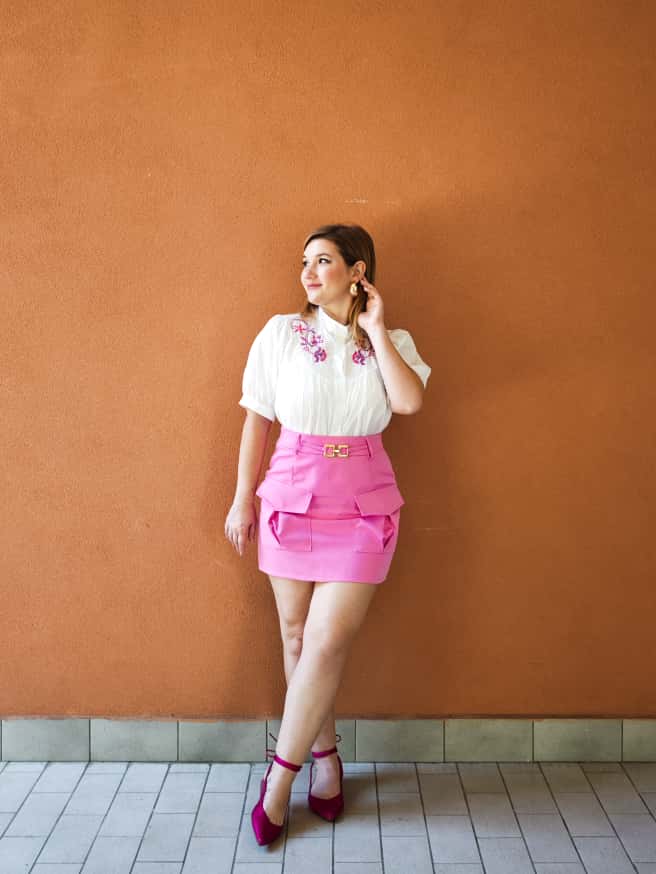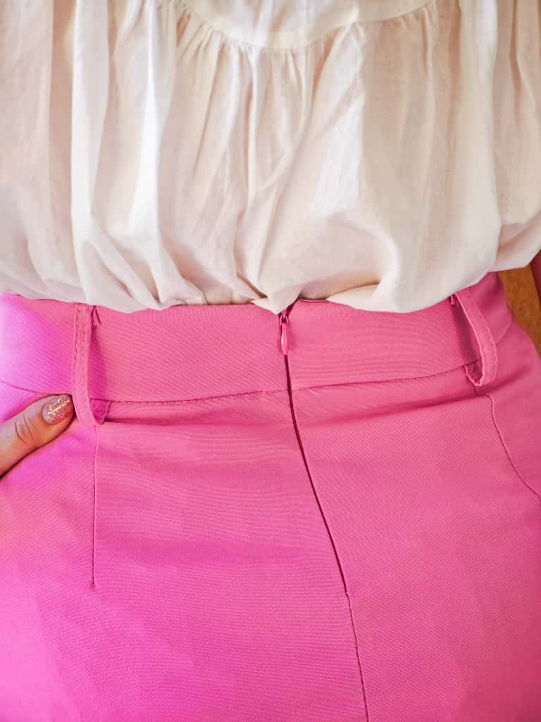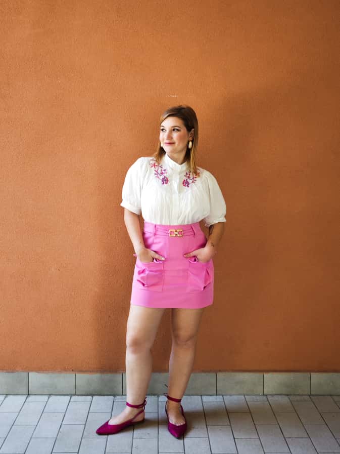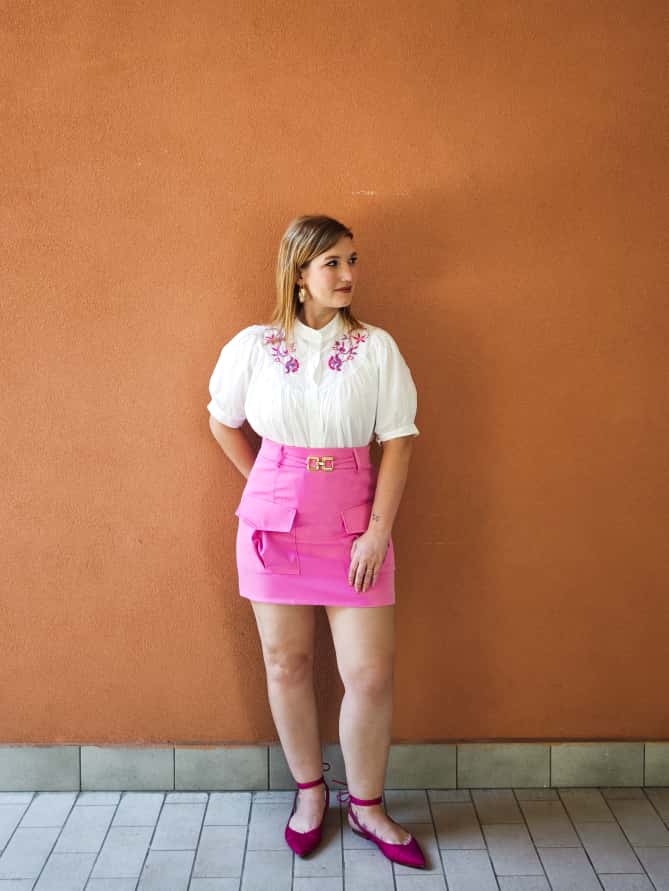 Minigonna color rosa Barbie, con tasche e cinturina con dettaglio oro.