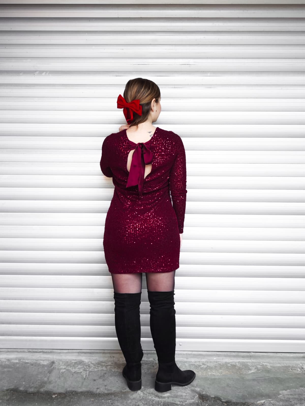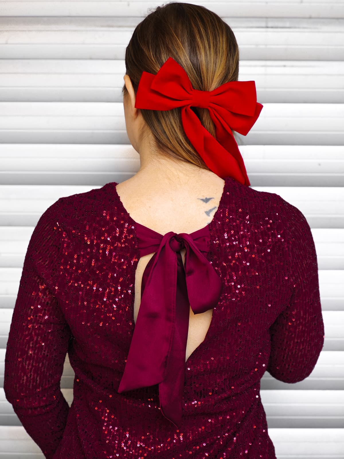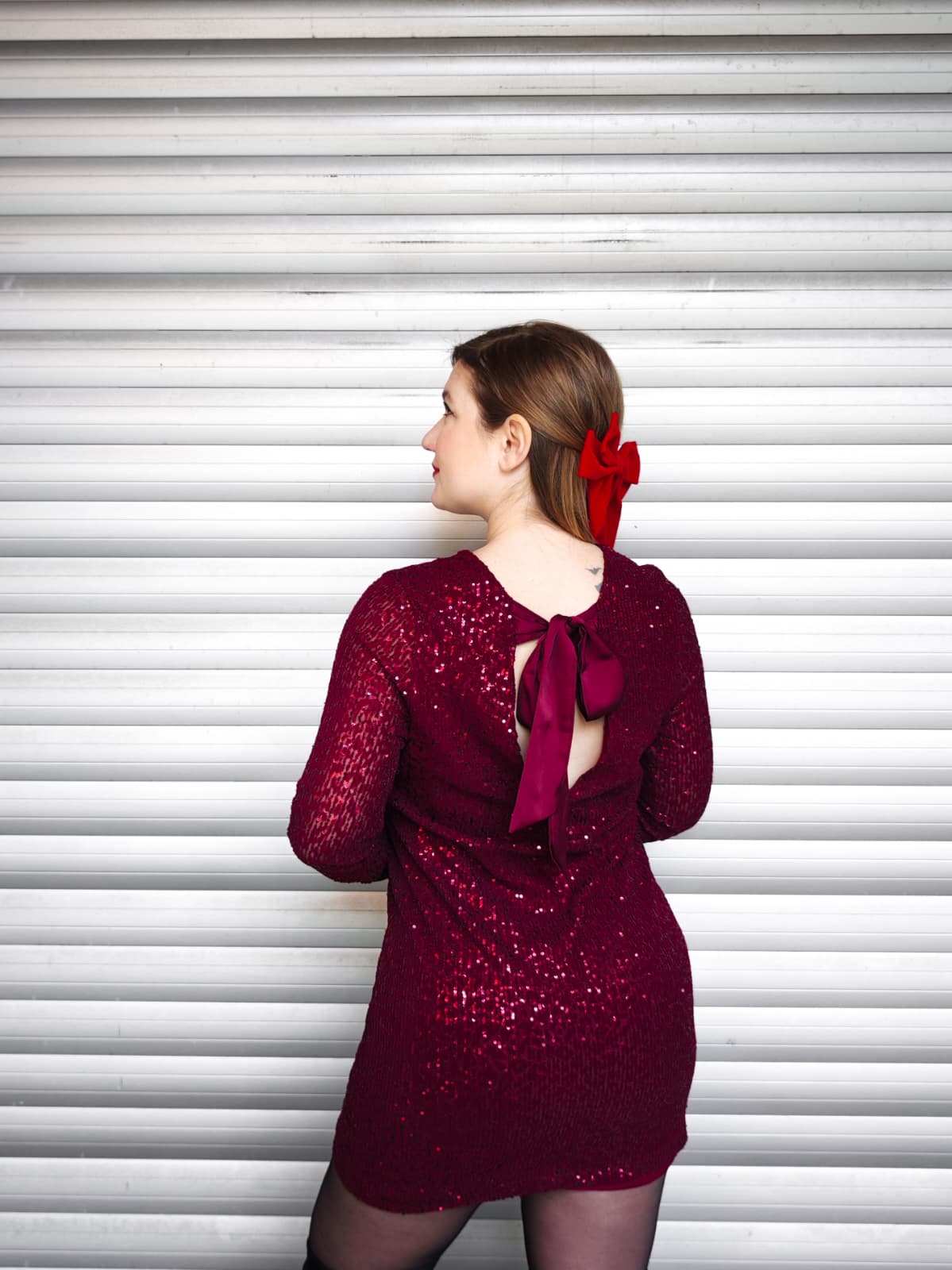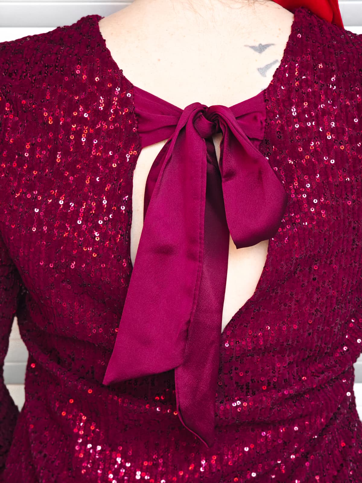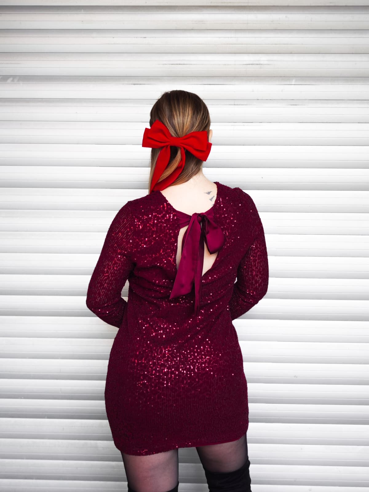 Abito corto con paillettes bordeaux e fiocco grande sulla schiena