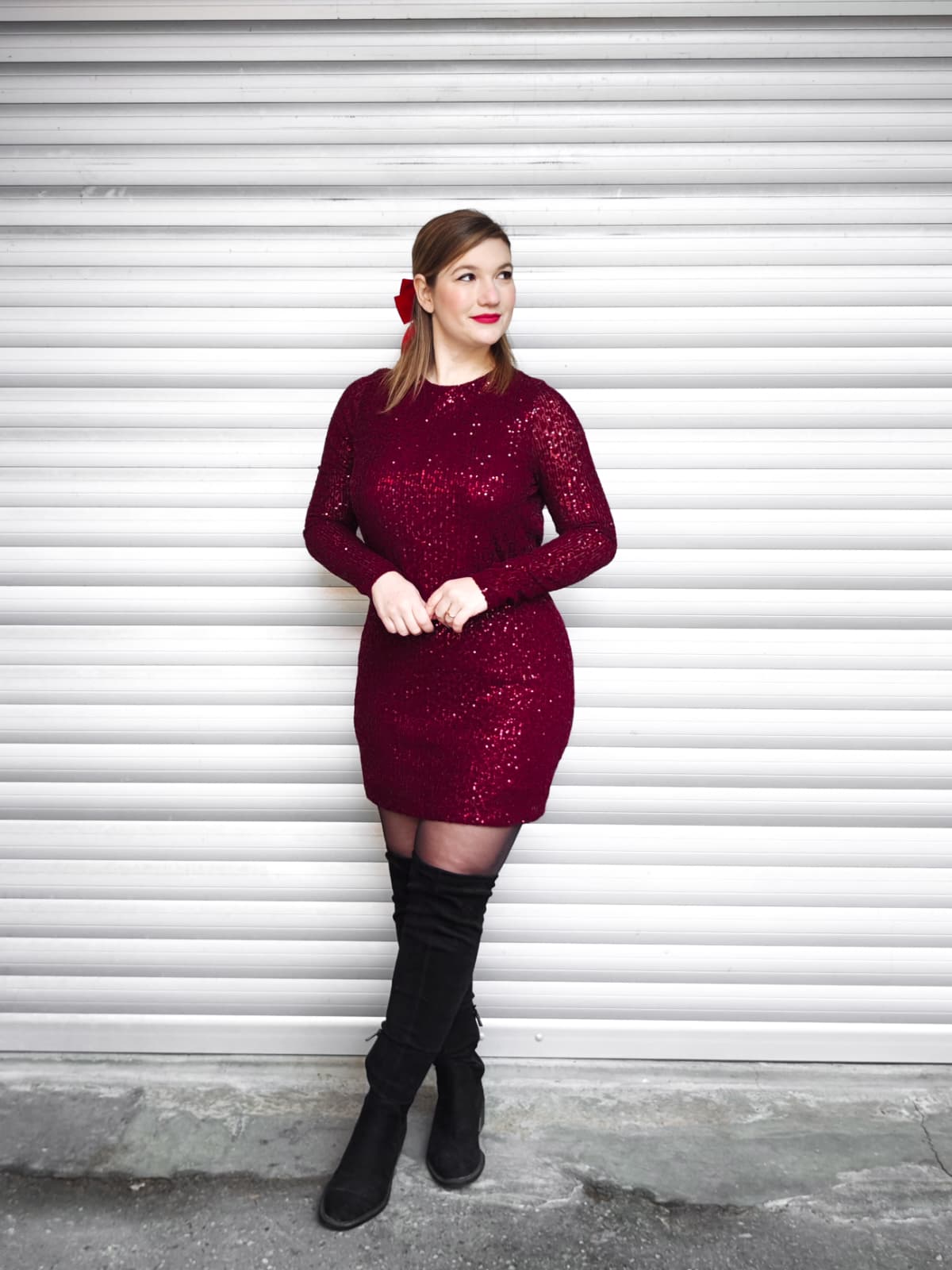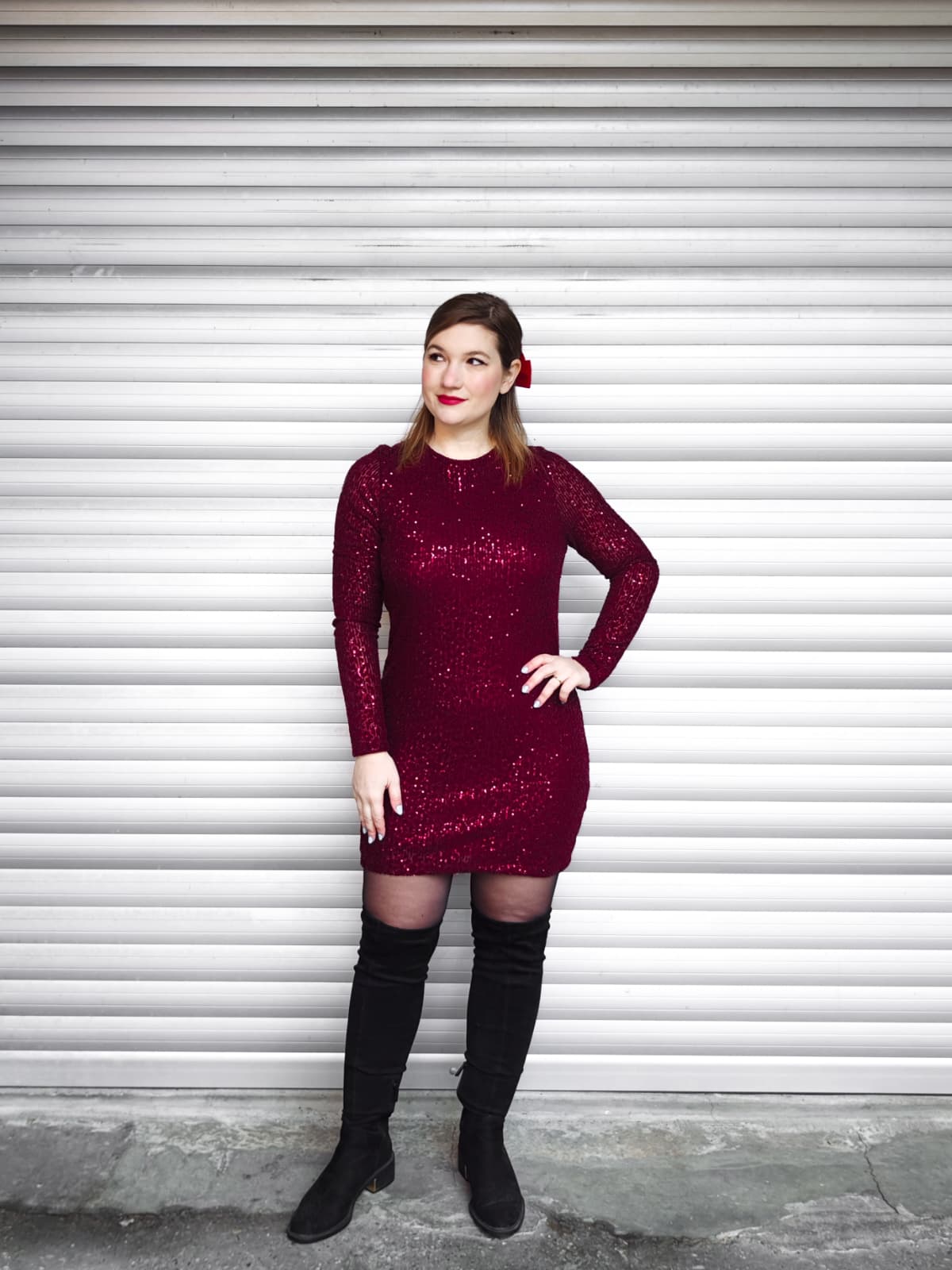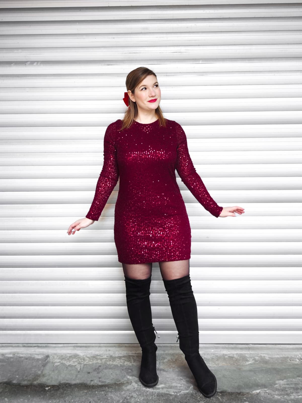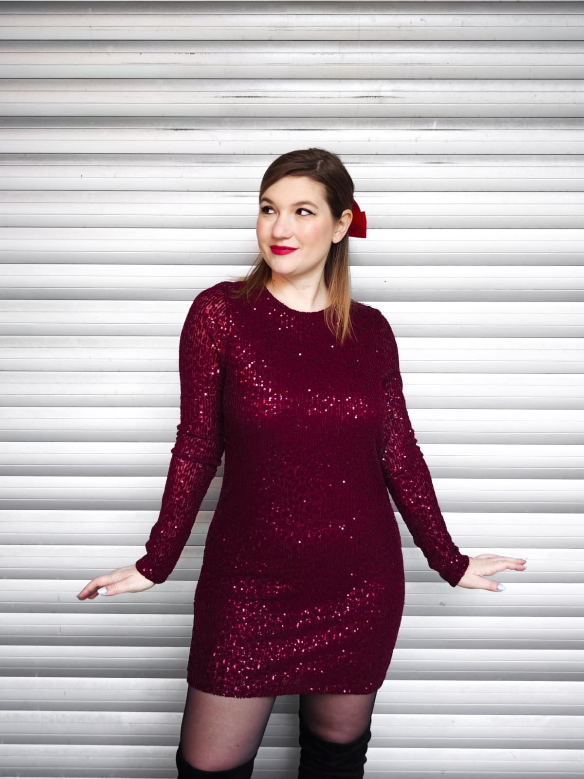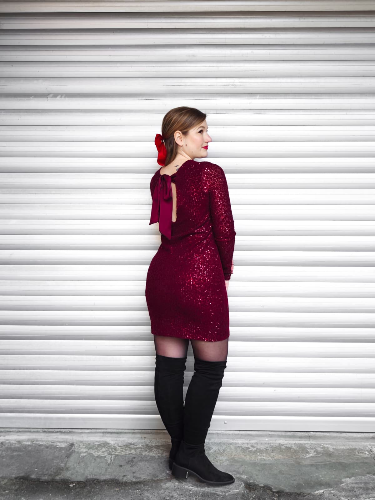 Abito corto con paillettes bordeaux e fiocco grande sulla schiena