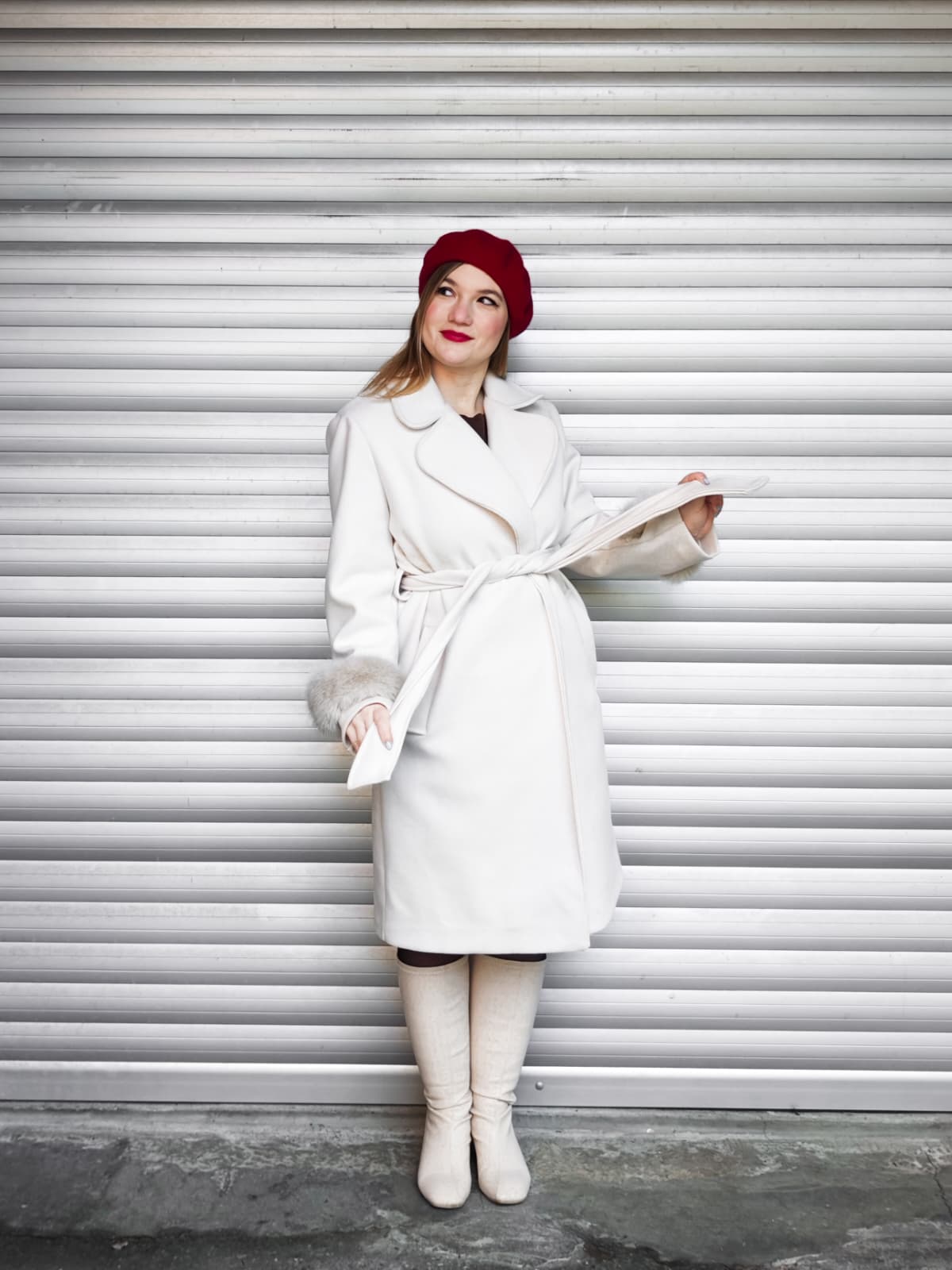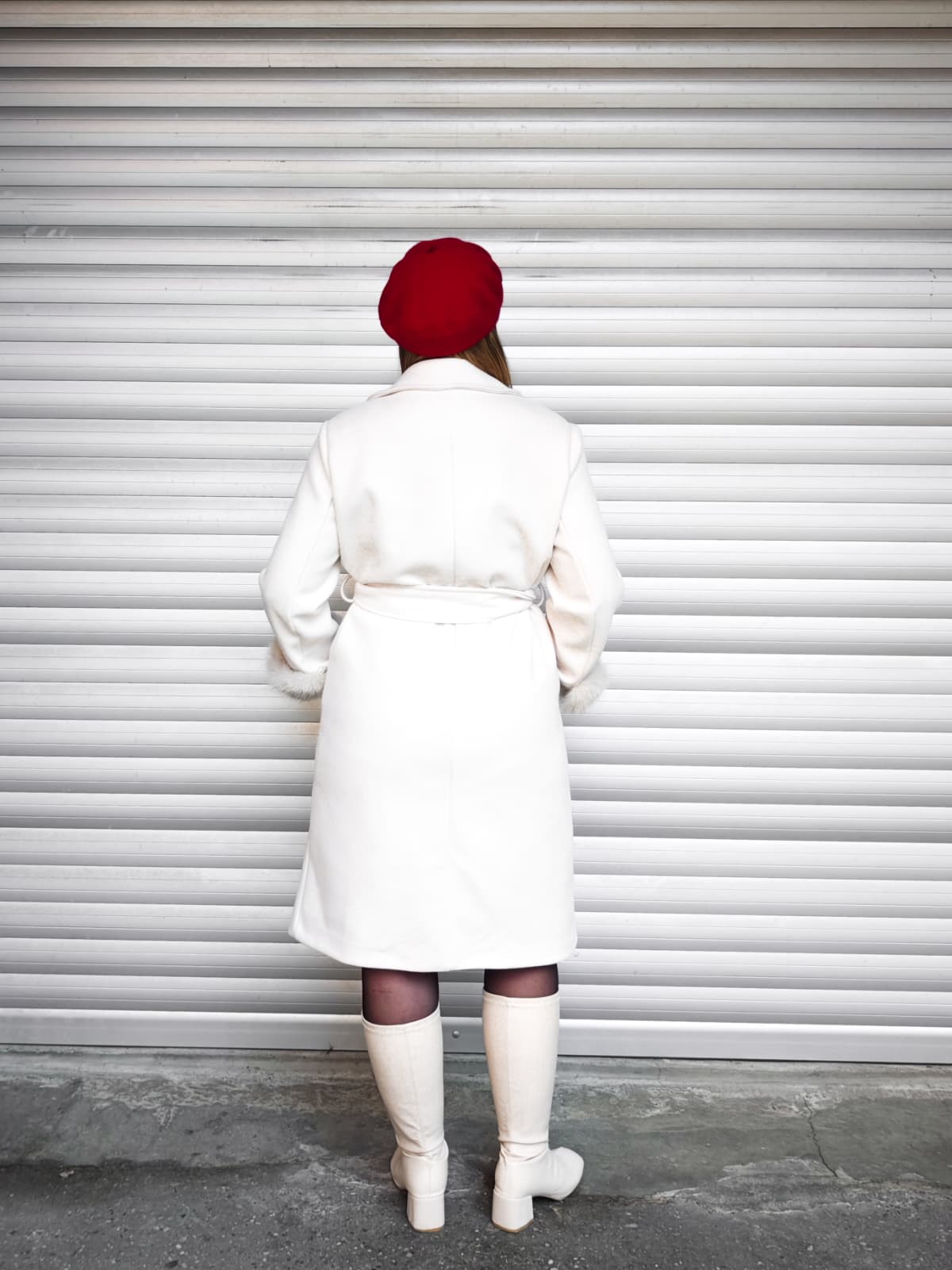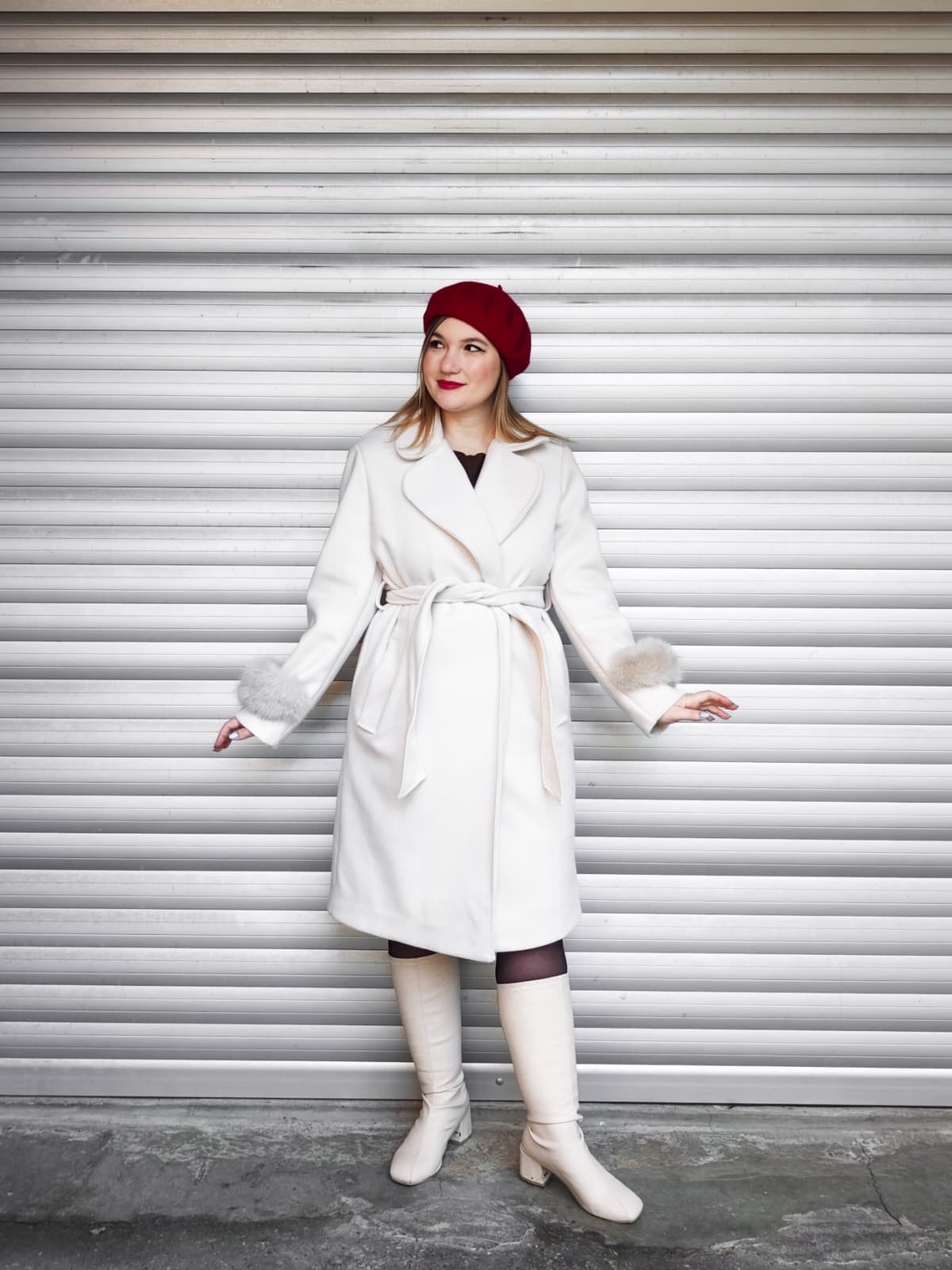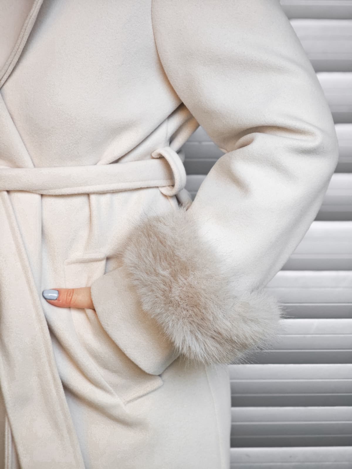 Cappotto color panna con pelliccia sintetica sulle maniche, dotato di cintura e fodera interna.