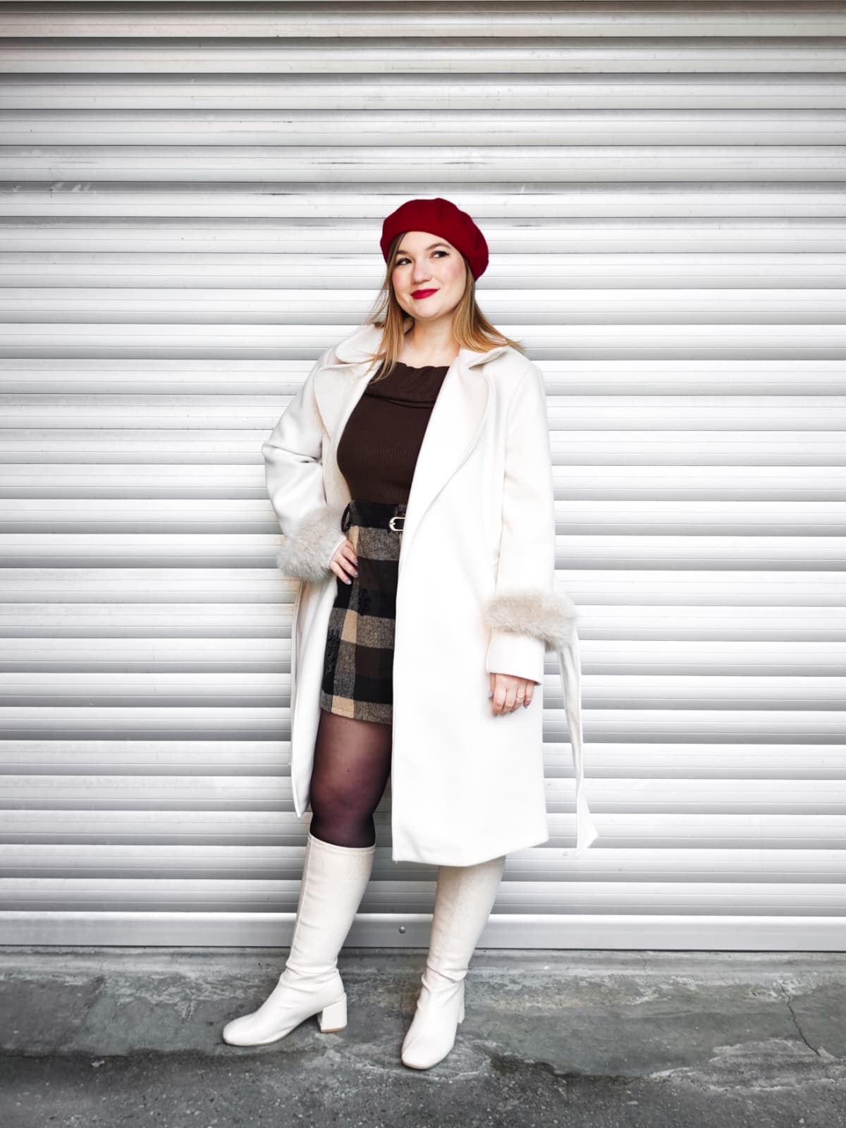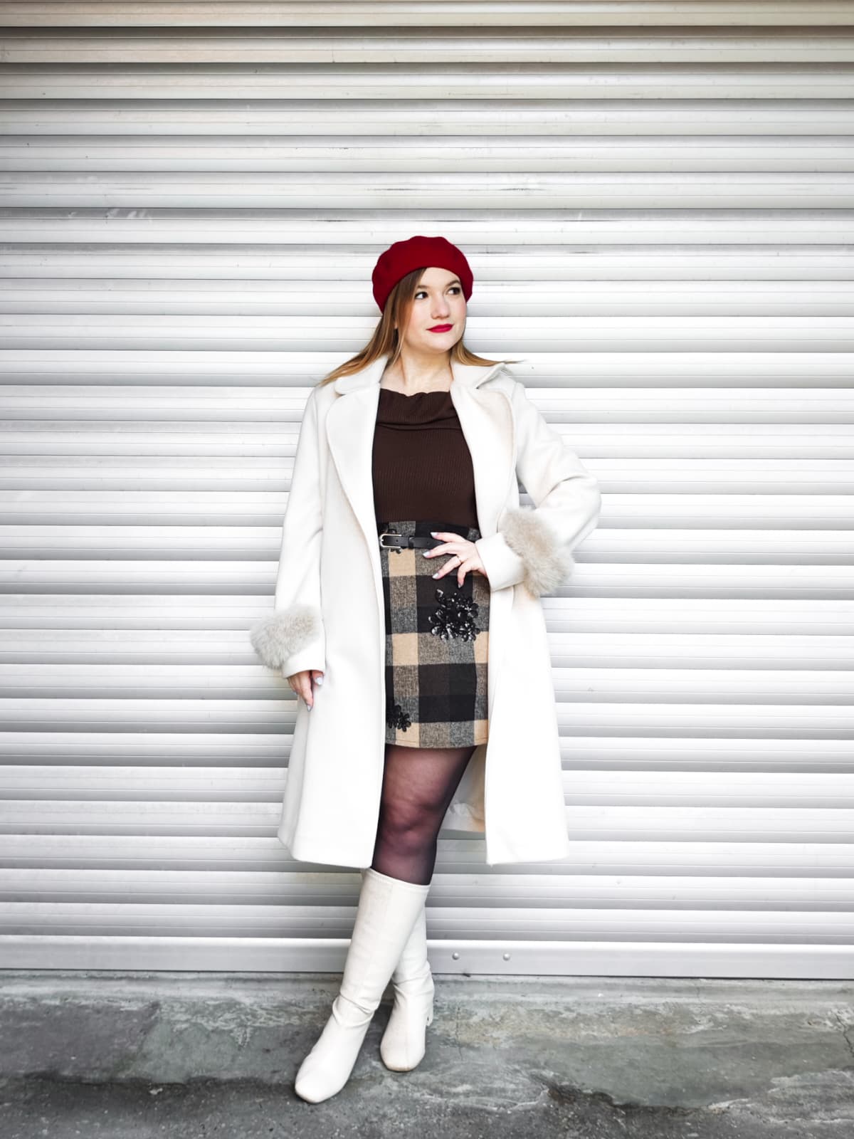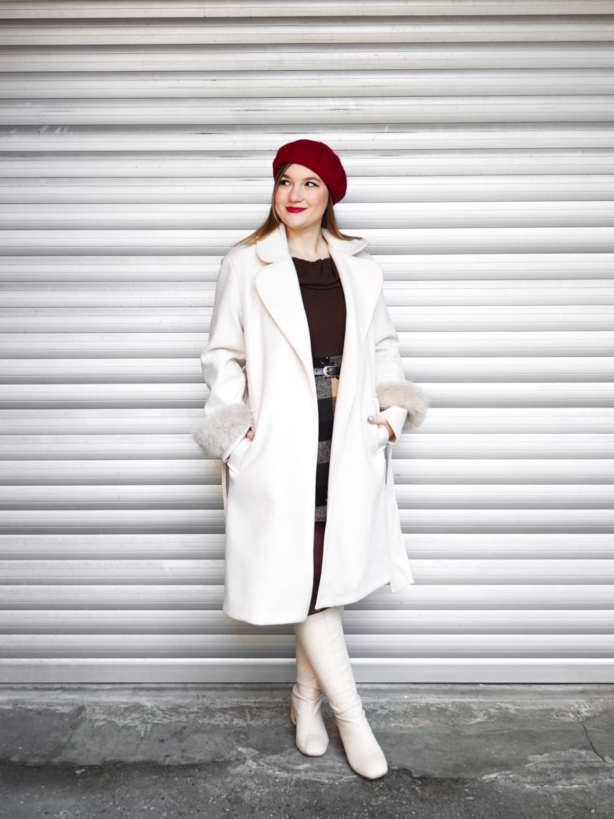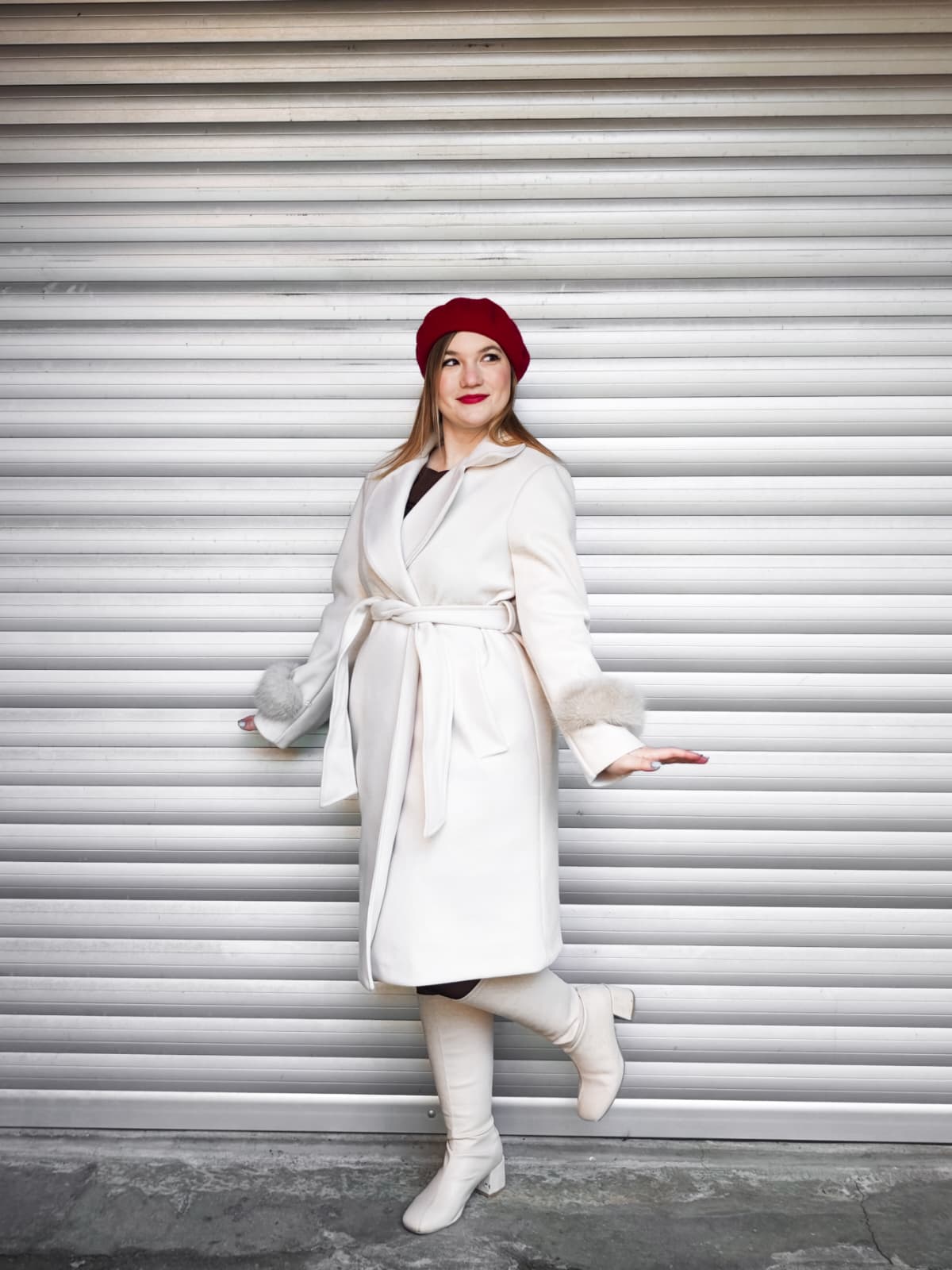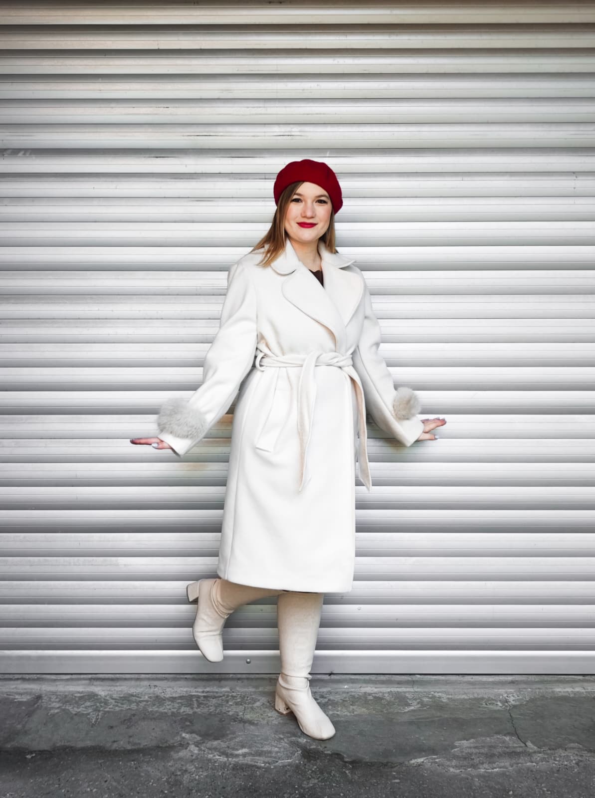 Cappotto color panna con pelliccia sintetica sulle maniche, dotato di cintura e fodera interna.