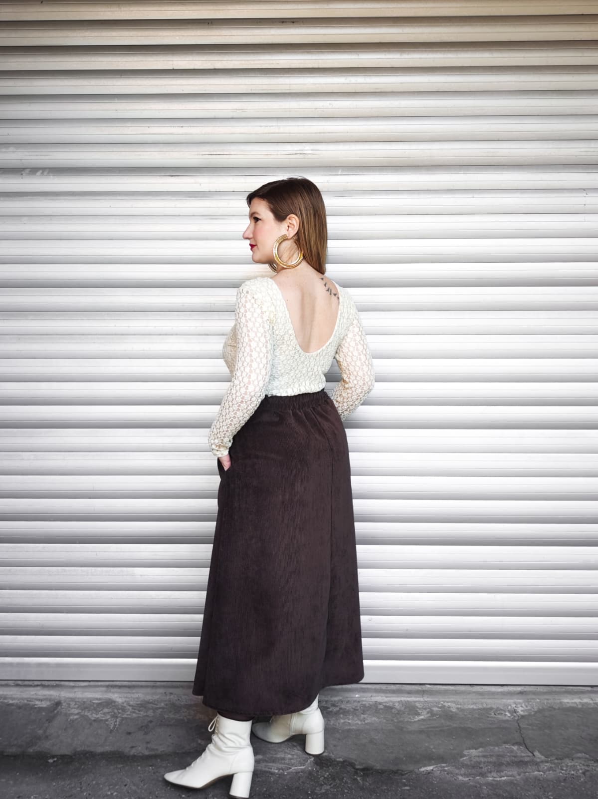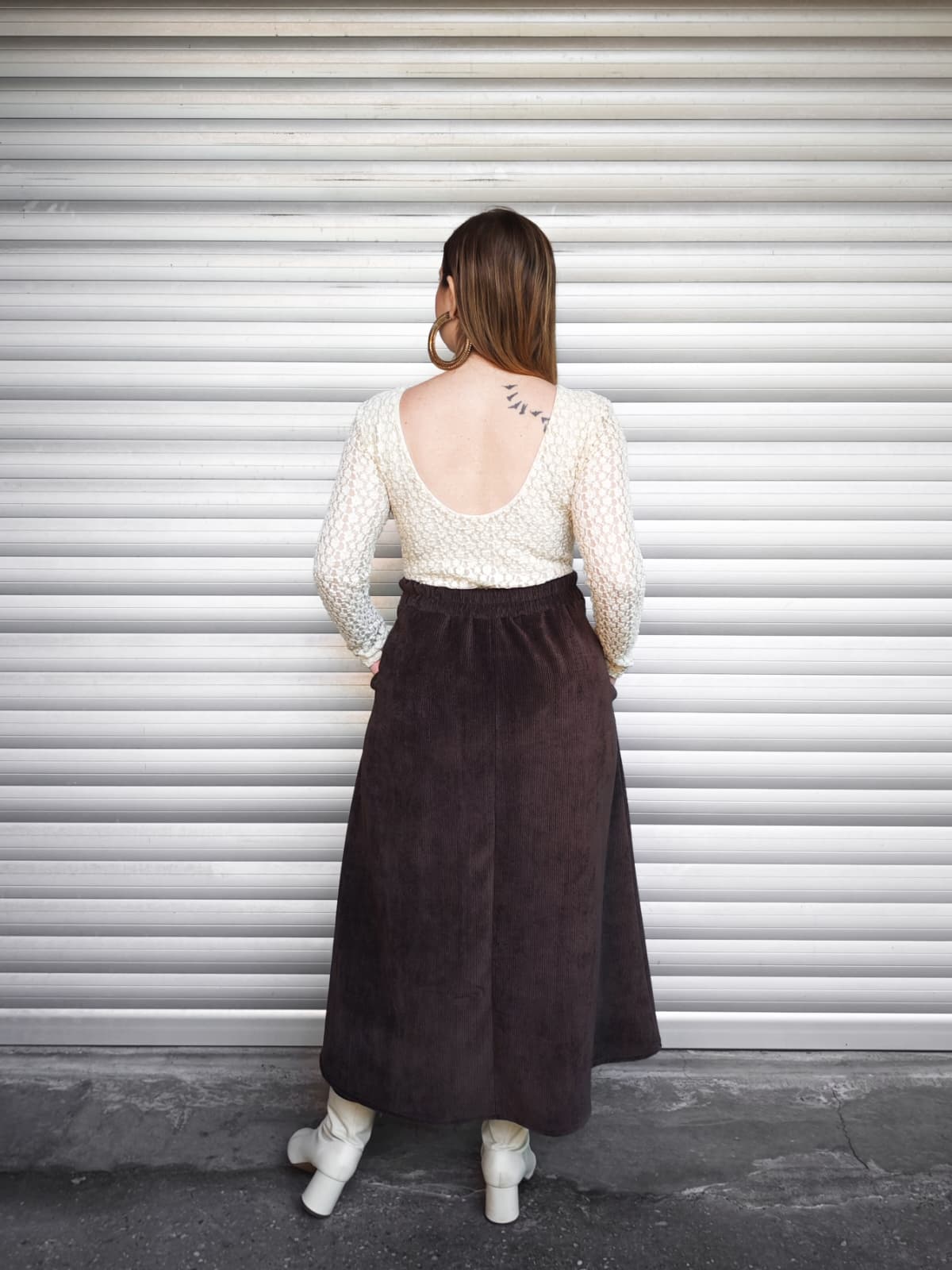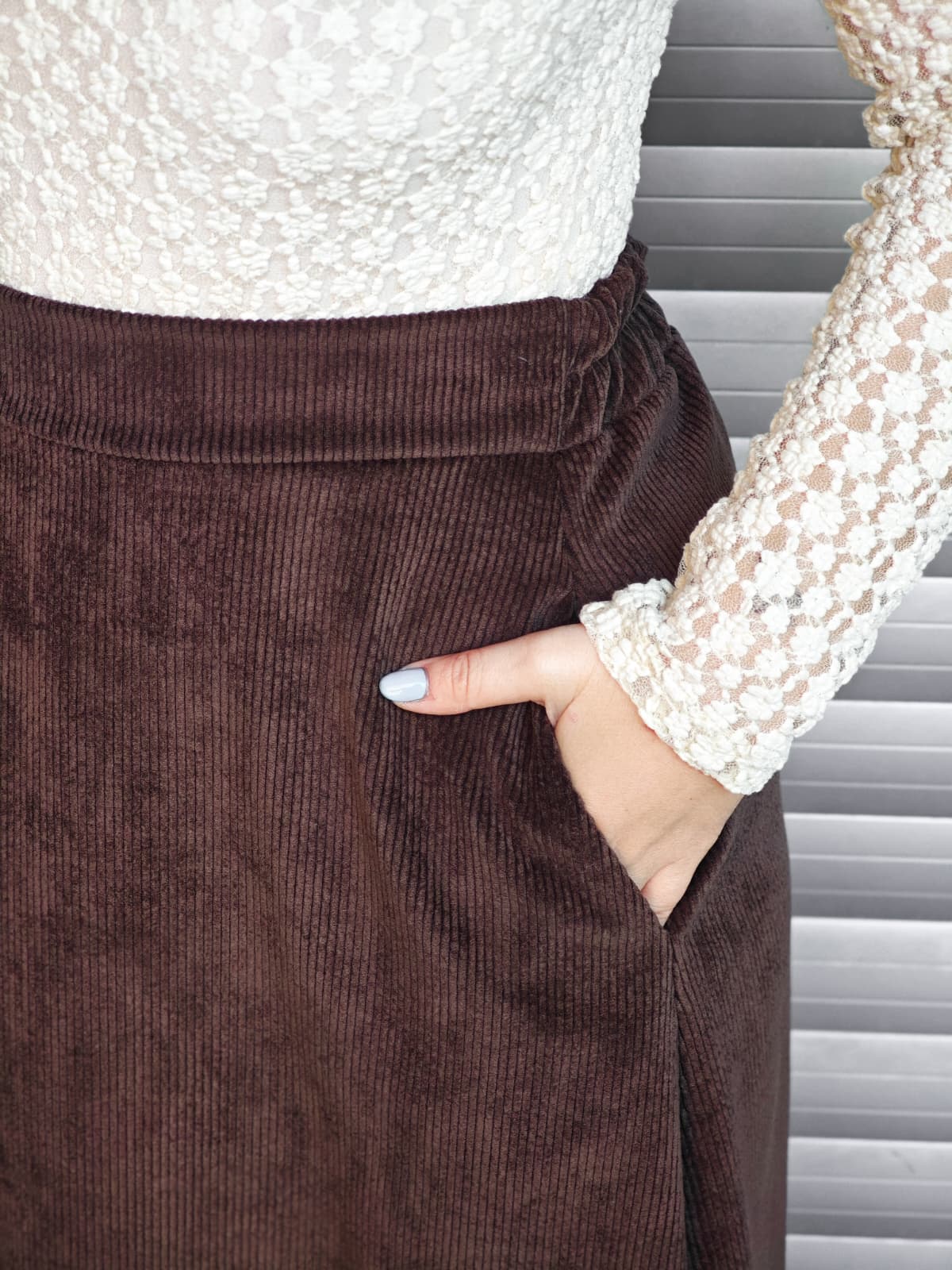 Gonna a vita alta in velluto marrone, a costine. Dotata di elastico in vita e tasche laterali.