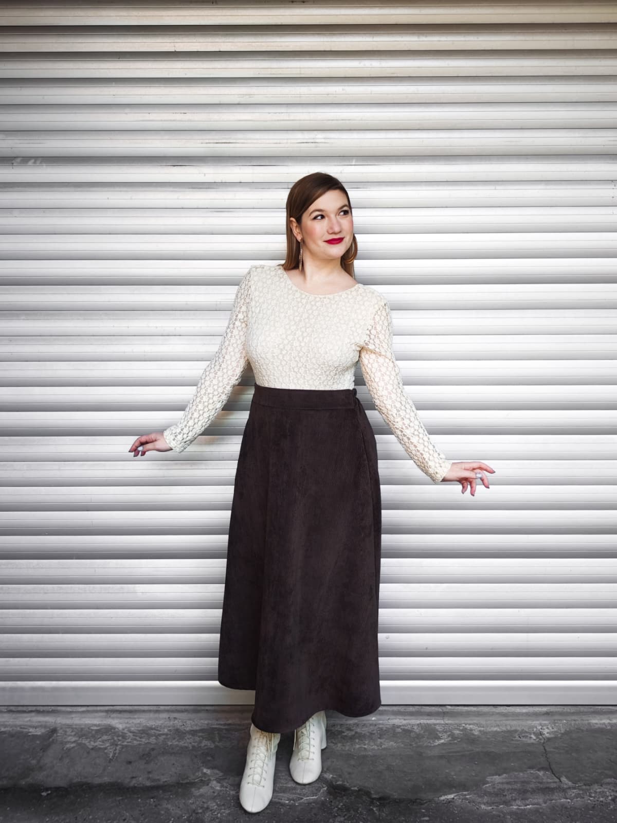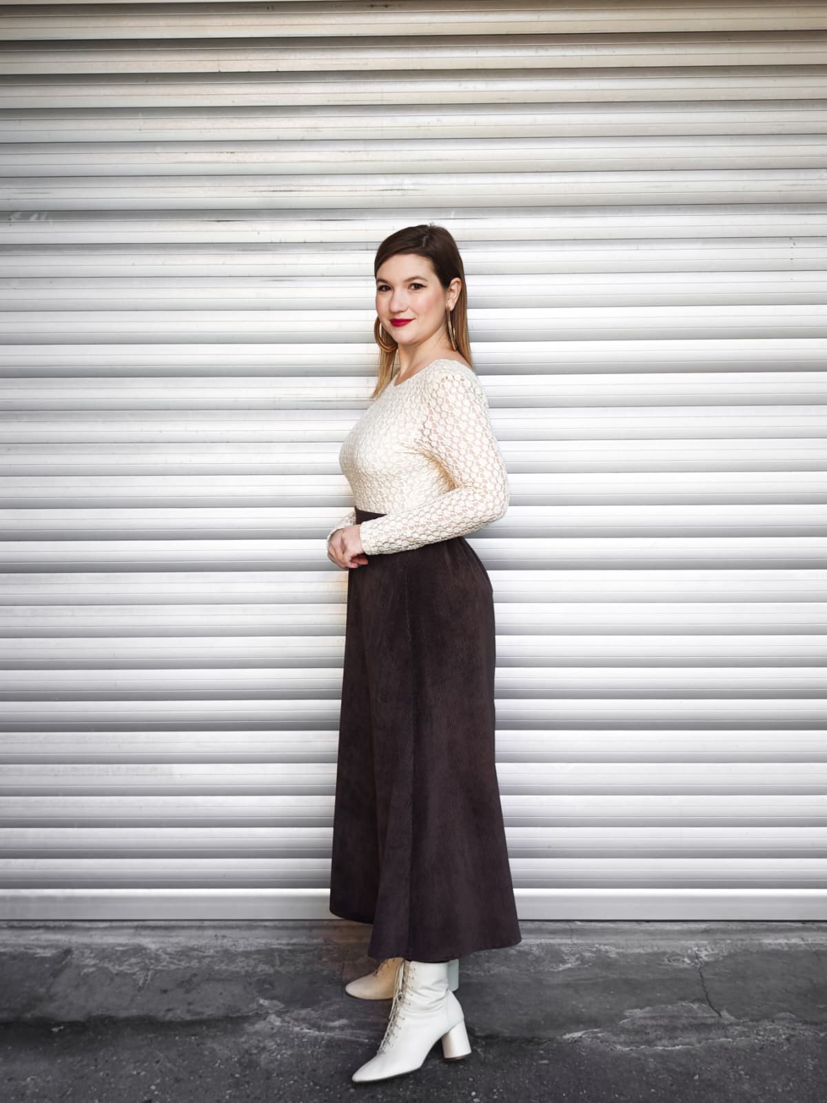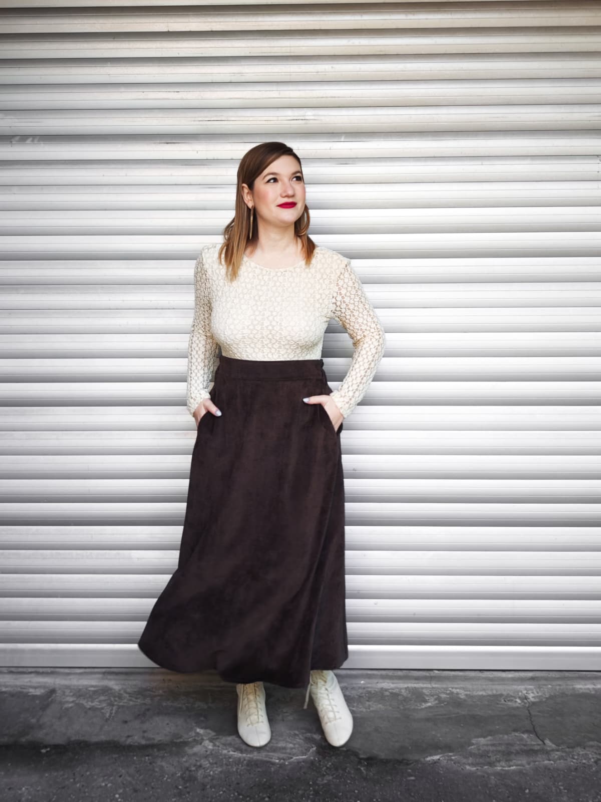 Gonna a vita alta in velluto marrone, a costine. Dotata di elastico in vita e tasche laterali.