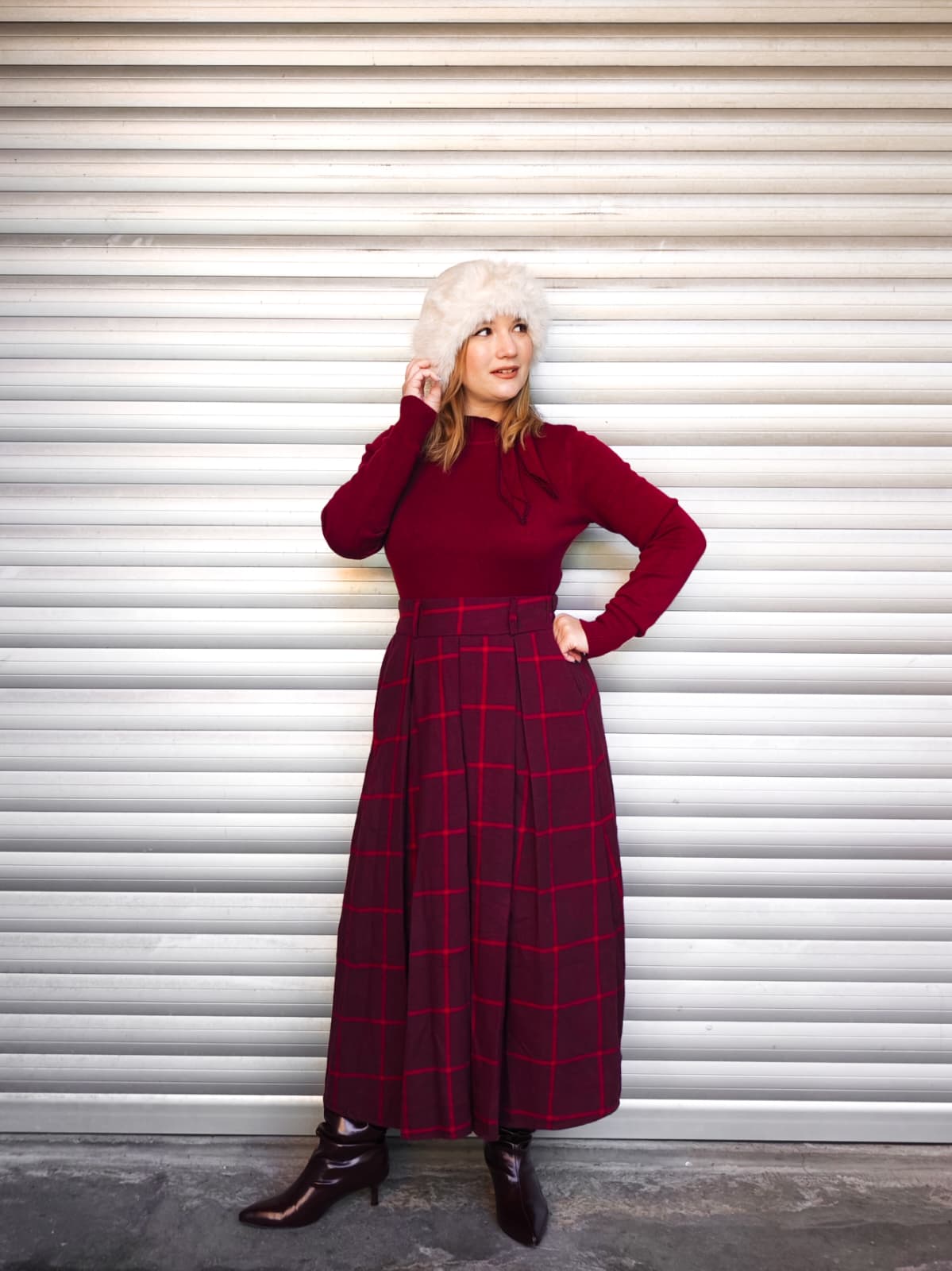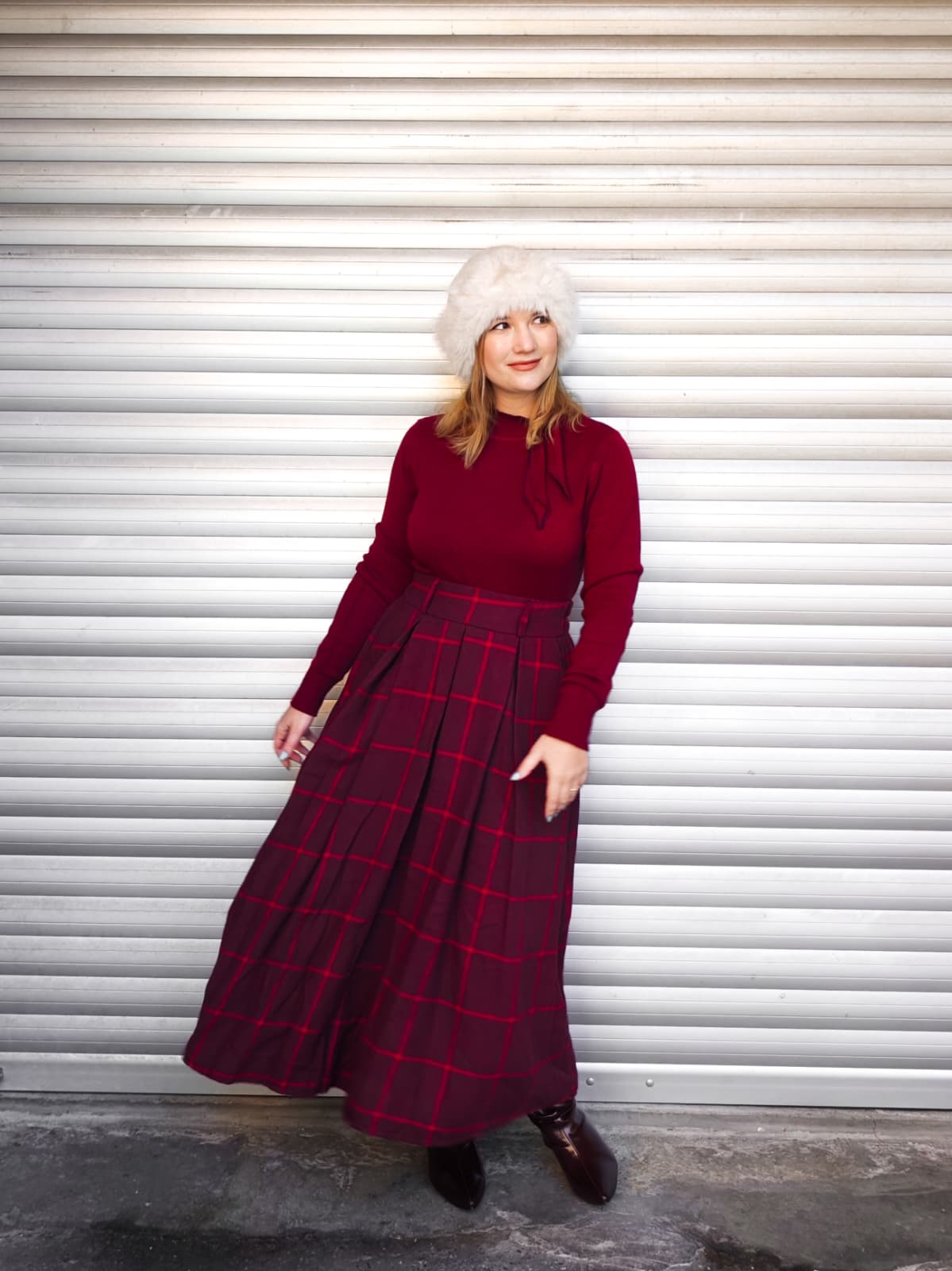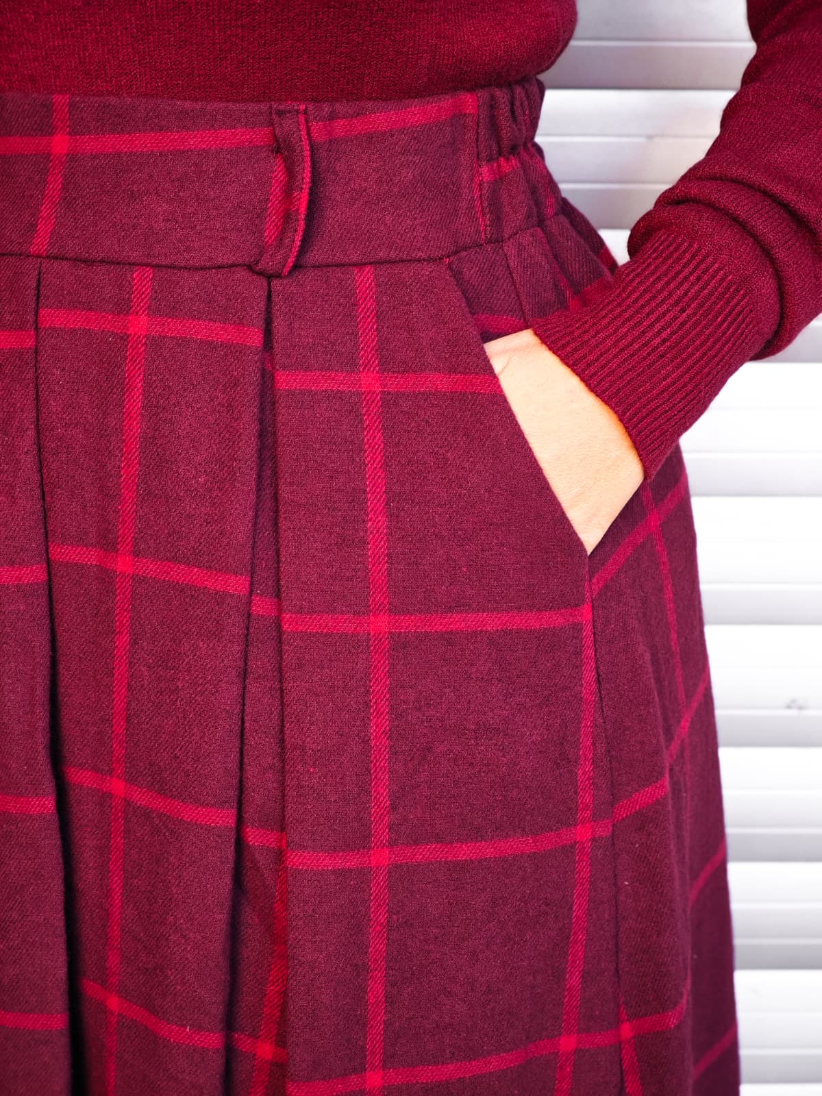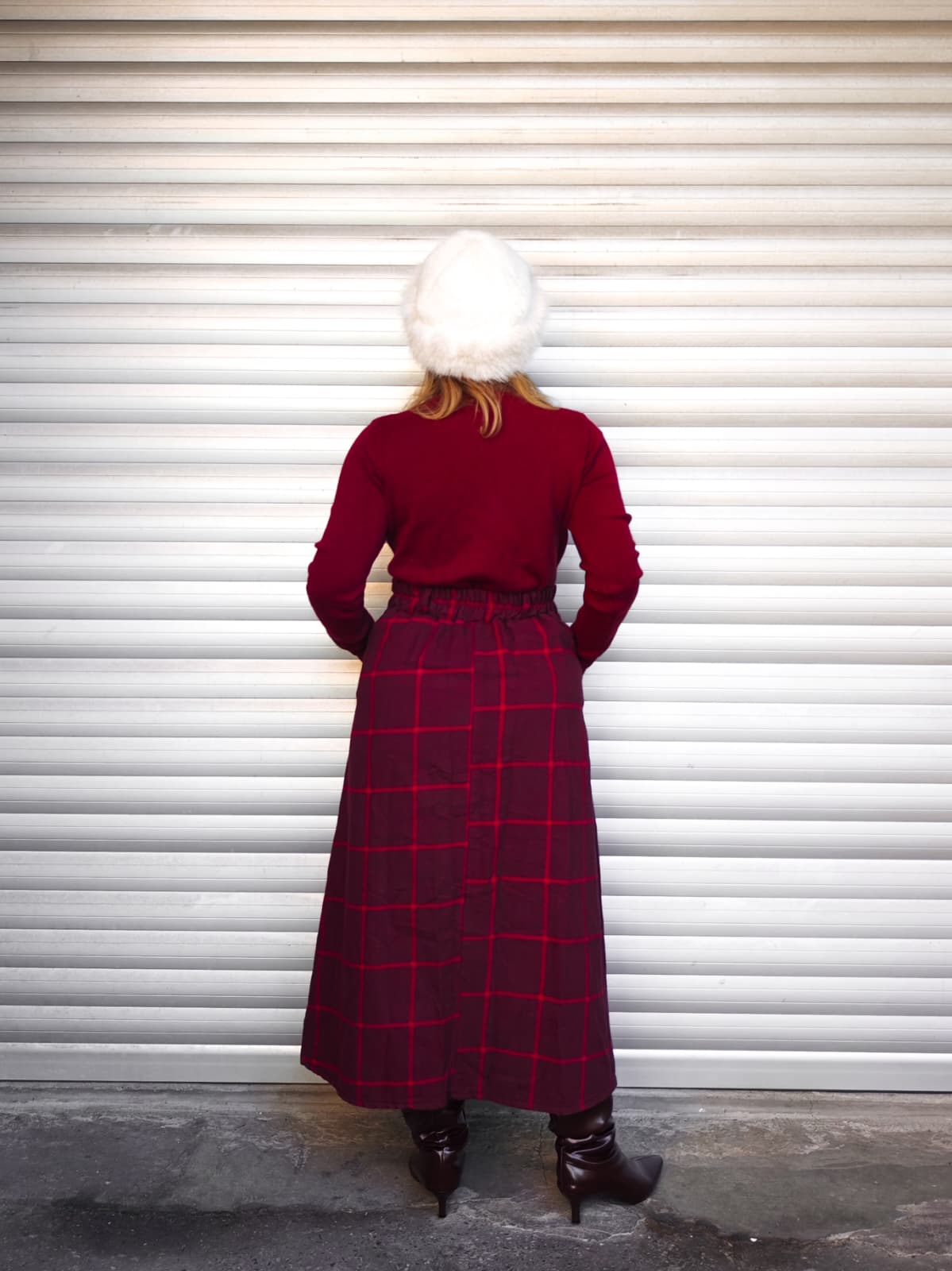 Gonna lunga a vita alta, con fantasia quadrettata tartan rossa. Dotata di elastico in vita.
