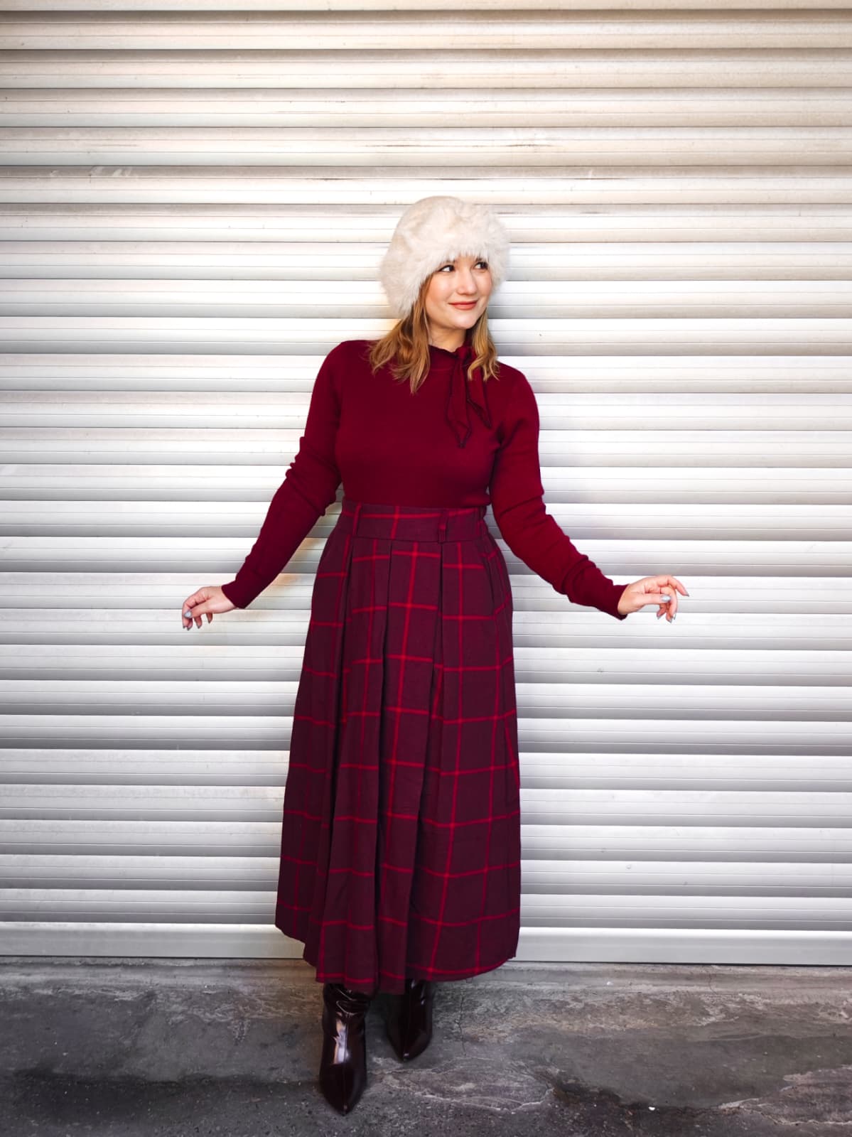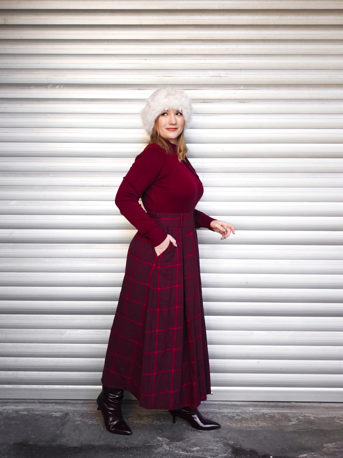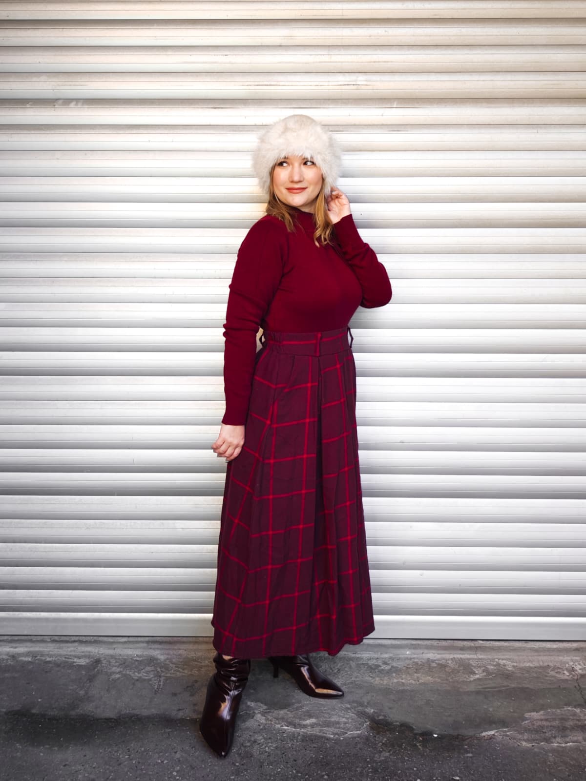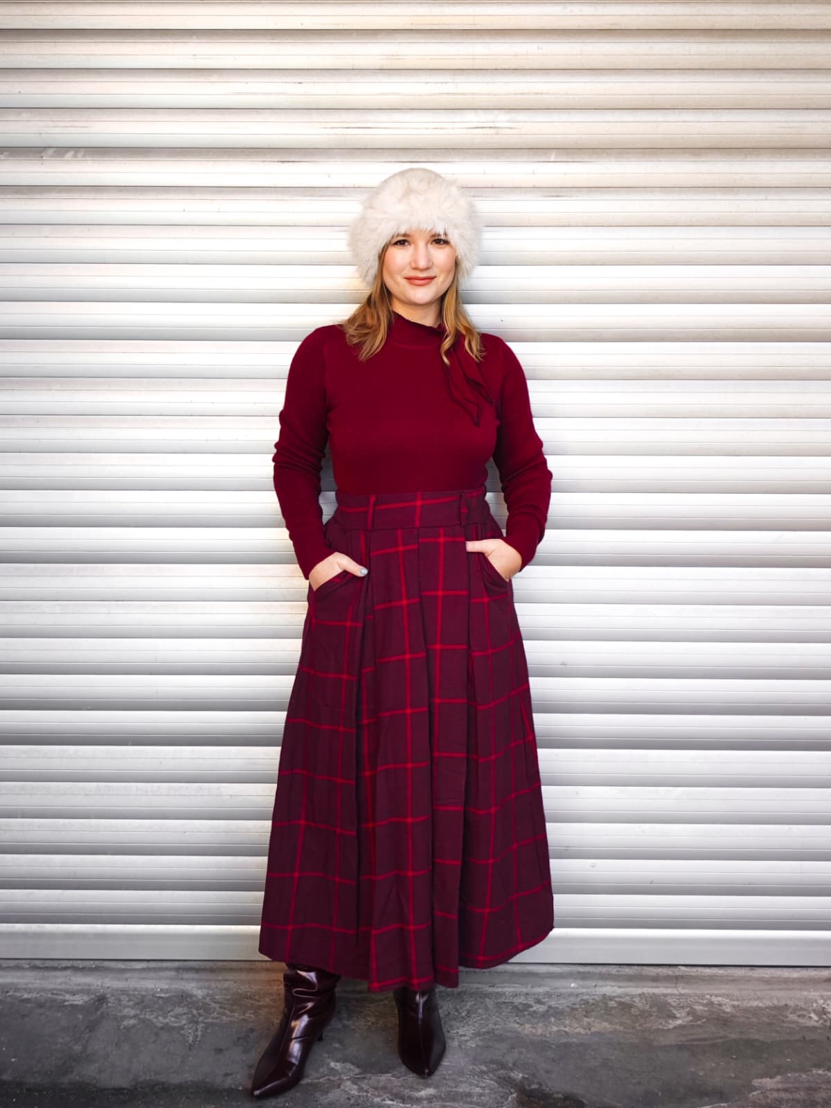 Gonna lunga a vita alta, con fantasia quadrettata tartan rossa. Dotata di elastico in vita.