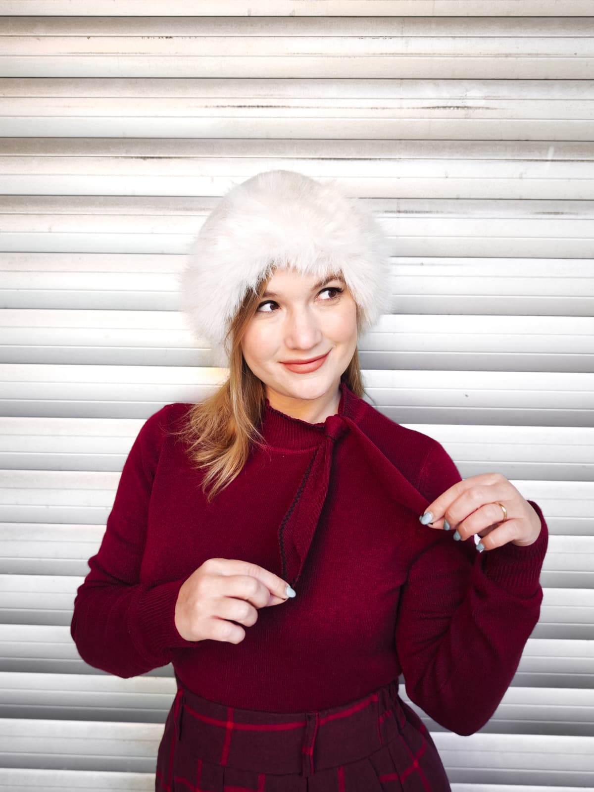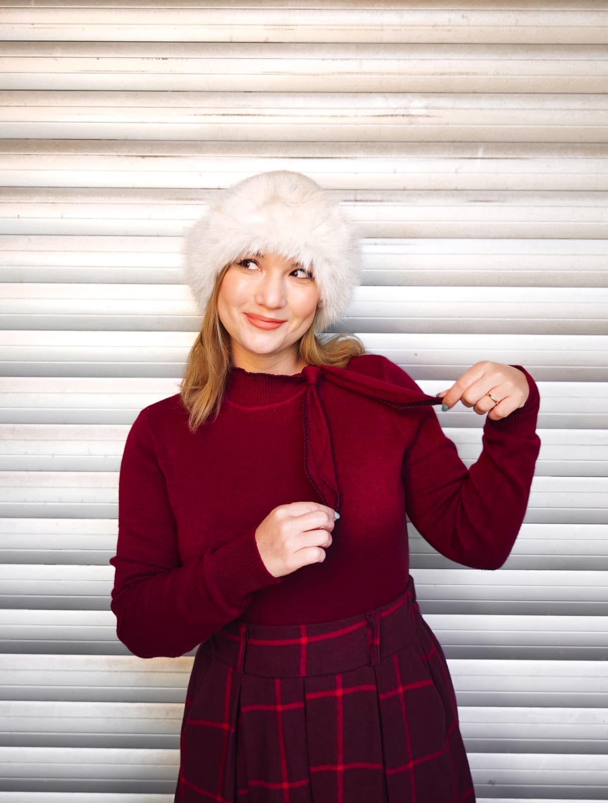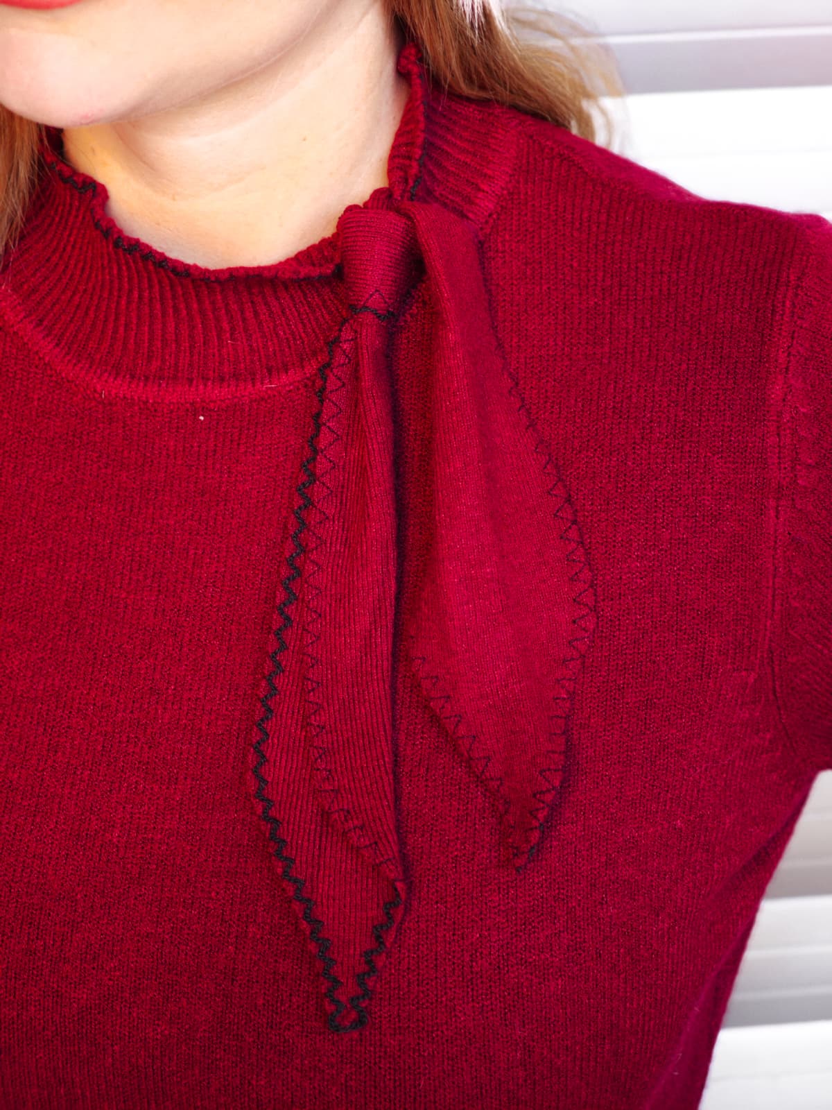 Maglioncino dolcevita color bordeaux, con nodo al collo.