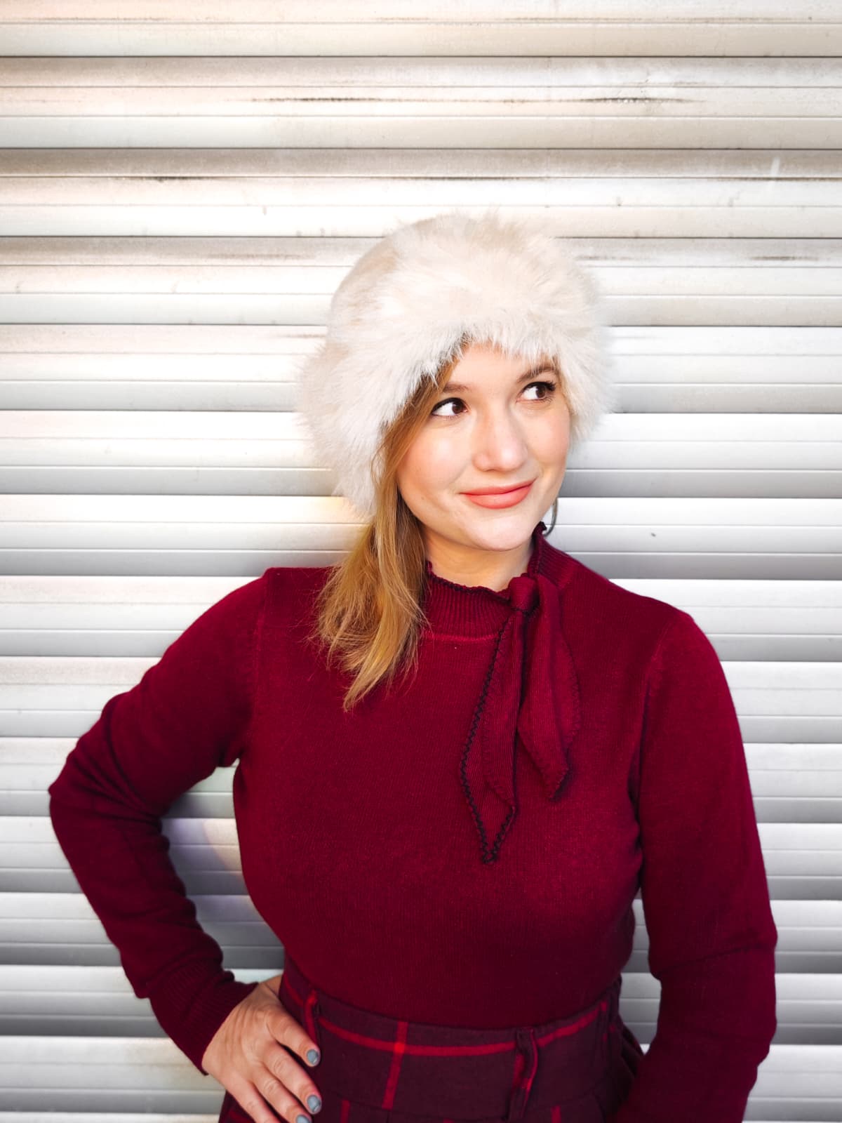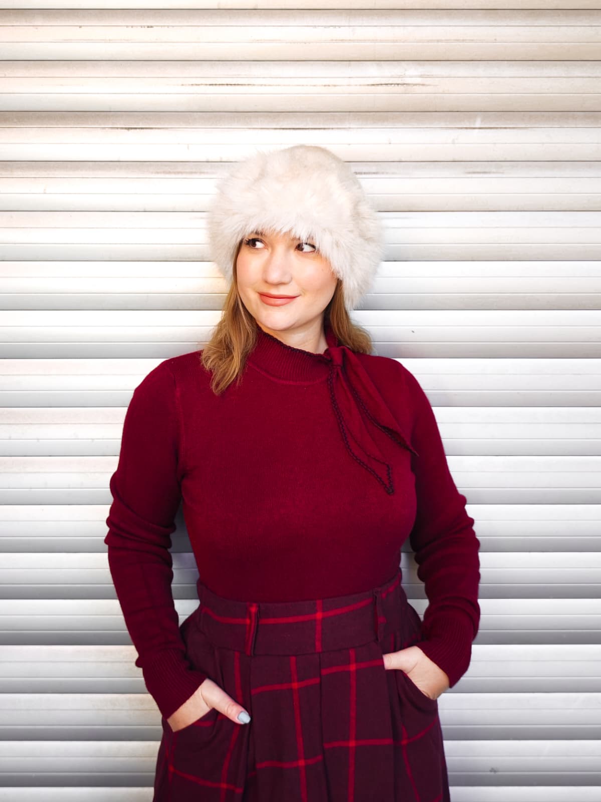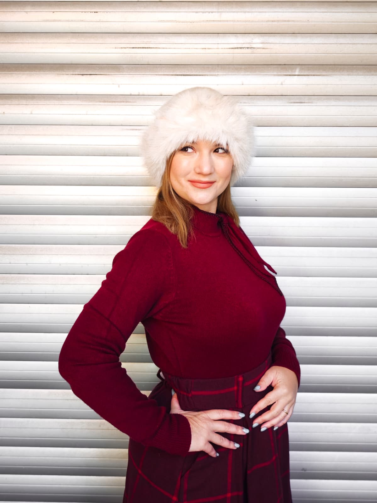 Maglioncino dolcevita color bordeaux, con nodo al collo.